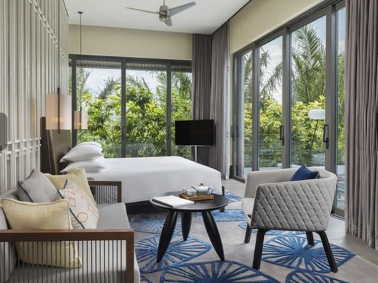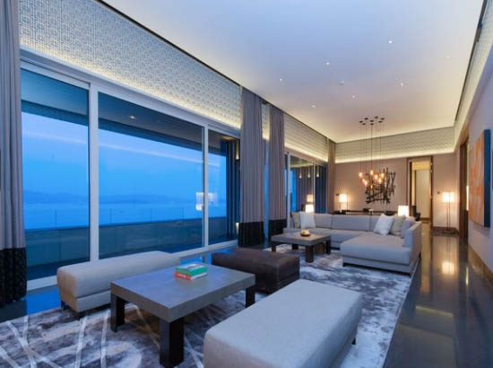 三亚太阳湾柏悦酒店建筑群沿着优美的私家海滩成拱形排列,彷如一串璀璨明珠,前面是壮丽磅礴的南中国海风光,后面是郁郁葱葱的青山茂林。酒店精致优雅的室内装饰无不体现出一种微妙的东方优雅,拥有雅适并俱的百余间望海客房,配备现代化完善设施,与柏悦一贯的亲切服务相互交融,致力为客人提供巧妙细致的个人化服务。